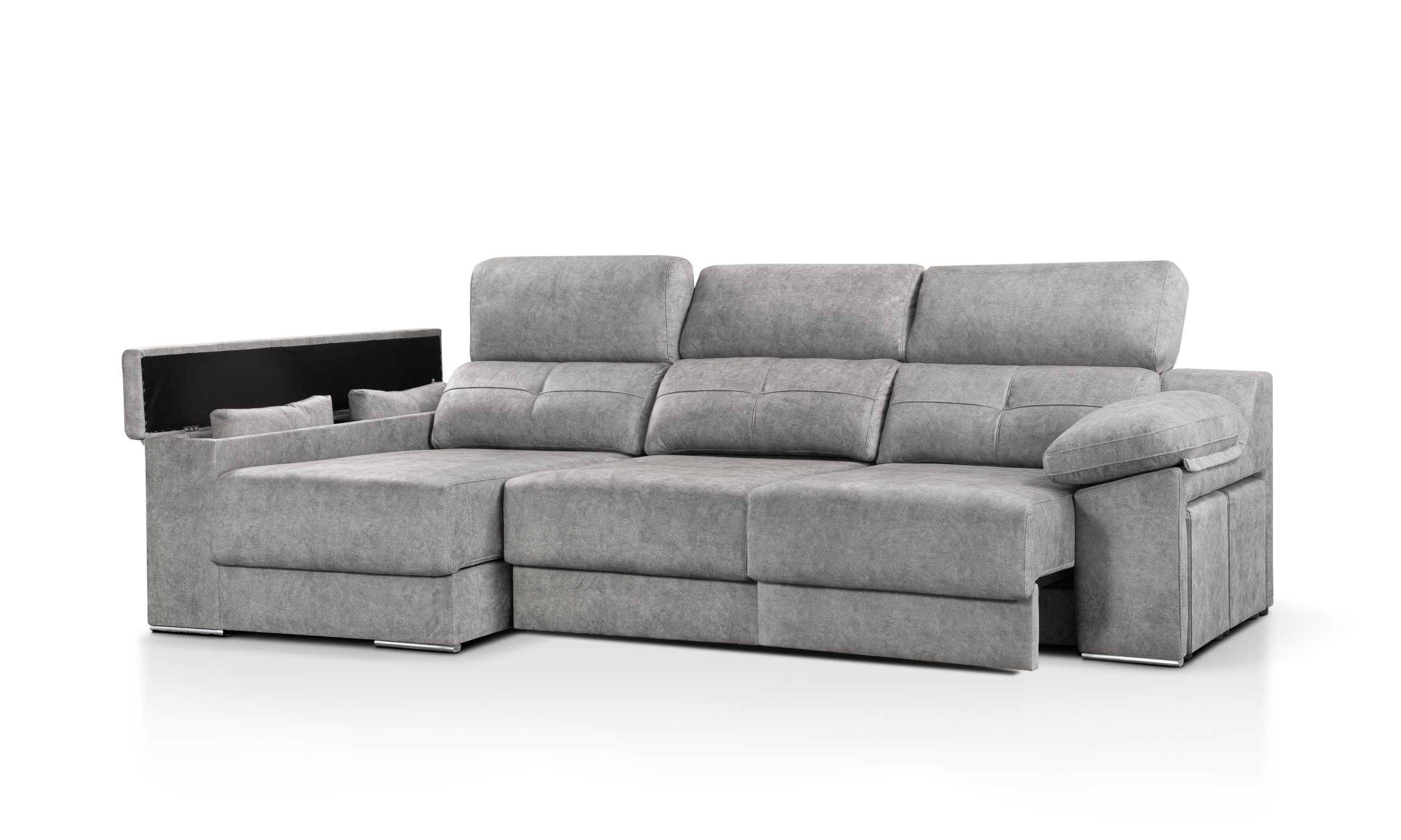 INCLUIDO DE SERIE: Patas metálicas delanteras, chaiselongue con arcón y brazo arcón, 2 cojines de decoración en chaiselongue, brazo de sofá con 2 taburetes.
